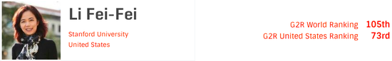 斯坦福大学计算机科学系第一位红杉教授李飞飞位列 105。2020 年 2 月,她当选为美国国家工程院院士;同年 5 月,担任 Twitter 公司董事会新独立董事 ;10 月,当选为美国国家医学院院士。