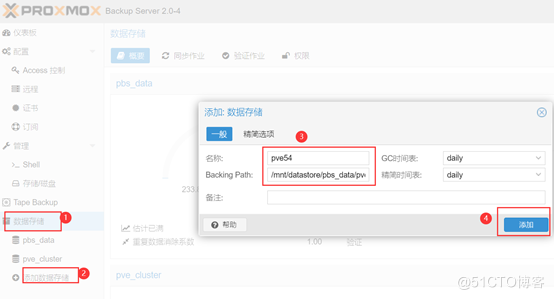 添加子目录pve_cluster与pve54。填写绝对路径时,输入/mnt/datastore/pbs_data/pve_cluster这样的内容。